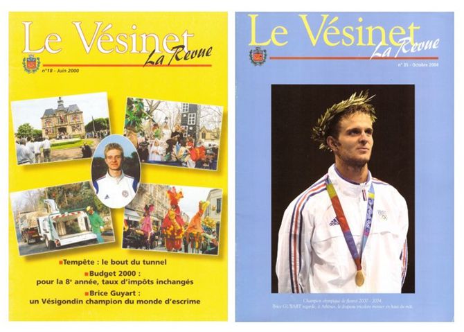 D'après les revues municipales du Vésinet. 2000, 2004, 2010. Cocorico(s) au Vésinet Dans le numéro de juin 2000 de la revue municipale du Vésinet, on découvrait le talent et les premiers succès d'un jeune escrimeur formé à la section escrime de l'Union Sportive du Vésinet (USV). Même en comptant à part tous les duels qui se sont déroulés, parfois sanglants voire mortels, sous nos paisibles frondaisons, l'escrime y a toujours connu le succès depuis la fin du XIXe siècle et de nombreux tournois de cette discipline y ont été organisés. Escrime [1] Quel spectacle ! Le Cirque d’hiver a été le témoin d’un événement exceptionnel. Un junior de 19 ans imposant sa fougue et son savoir-faire dans le respect de l’éthique sportive, a fait chavirer tous les fans de l’escrime française. Après un parcours exemplaire, la touche victorieuse en finale du challenge AXA (le Roland Garros de l’escrime) propulsait Brice Guyart, sociétaire de l’US Vésinet dans les sélectionnables olympiques de Sydney un rêve que son maître d’armes Gérard Rousseau lui prévoyait en 2004, avec sa sœur Astrid ! D’ailleurs, l’un ne va pas sans l’autre. Astrid et Brice ont terminé 7e des derniers championnats du monde cadets juniors à South-Bend aux USA. Brice est ensuite devenu champion du monde junior par équipe. Leurs qualités sont en tous points similaires : généreux dans le travail, perfectionnistes, ambitieux, du caractère pour deux, une tête bien sur les épaules, une personnalité attachante. Que dire de plus ! La sélection de Brice pour les Jeux Olympiques à Sydney se jouera les 3 et 4 juin à Vienne. Malgré son jeune âge, il sera retenu dans l'équipe de France des JO de Sydney. Lors de l'épreuve individuelle, il sera éliminé en seizièmes de finale ... par le futur vainqueur, le Sud-Coréen Kim Young-ho. Mais dans l'épreuve par équipe, il participe à la conquête du titre olympique avec Jean-Noël Ferrari, Lionel Plumenail et Patrice Lhotellier. A dix-neuf ans, il devient le plus jeune fleurettiste français médaillé d'or aux JO. Couvertures de la revue municipale du Vésinet consacrées à Brice Guyart n°18 juin 2000 et n°35 octobre 2004 (coll. shv) Lors des jeux Olympiques d'Athènes en 2004, Brice Guyart, bien conseillé par le maître d'armes Patrice Menon, va conquérir la médaille d'or de l'épreuve individuelle à l'issue d'un tournoi fertile en émotions : mené 7 touches à 12 par l'Italien Andrea Cassara en demi-finale, il parvient à s'imposer 15 touches à 12 puis, en finale, il domine le favori, l'Italien Salvatore Sanzo (15-13). Douze ans après Philippe Omnès, couronné à Barcelone et désormais directeur technique national des équipes de France d'escrime, un autre fleurettiste français est champion olympique. Brice Guyart, Champion olympique [2] Au cœur d’un été vésigondin des plus calmes, une étincelle a jailli le lundi 16 août. Ce fut en effet la « journée exceptionnelle » d’un jeune vésigondin de 23 ans à Athènes. Devenu déjà en 2000 à Sydney champion olympique de fleuret par équipes, Brice Guyart, qui aura passé 15 ans de sa jeune carrière à l’Union sportive du Vésinet (USV), a réussi l’exploit de conquérir le titre olympique dans la compétition individuelle. Après s’être défait aisément d’un Algérien, puis d’un de ses amis de l’équipe de France, il dut ensuite affronter les trois meilleurs escrimeurs mondiaux du moment et vaincre successivement, en quart de finale, l’Allemand champion du monde en titre et en demi-finale puis en finale les deux Italiens, figurant en tête du classement mondial. Voilà donc notre concitoyen Brice, troisième champion olympique de l’histoire du Vésinet. Le premier fut l’haltérophile Charles Rigoulot né au Vésinet, médaille d’or aux Jeux olympiques de Paris en 1924, la deuxième fut Virginie Hériot, native du Vésinet, championne olympique de voile aux Jeux olympiques d’Amsterdam en 1928. Pour tous ceux qui ont pu suivre cette journée à la télévision et pour le maître d’armes qui l’a formé au Vésinet, Maître Rousseau [3], directeur des Sports de la Ville, et qui était présent à Athènes en sa qualité d’arbitre international, Brice a fait preuve d’une lucidité exemplaire face à des Italiens comédiens ou truqueurs, de détermination et de clarté d’analyse pour savoir faire évoluer instantanément son jeu en fonction du comportement de ses adversaires. L’ayant rencontré chez ses parents au Vésinet le soir de son retour d’Athènes, je peux vous garantir que le succès ne lui est pas monté à la tête et qu’il se prépare à aborder avec autant de sérieux et d’ardeur sa dernière année d’école d’ingénieur en informatique.... L'exploi de Brice Guyart en tournoi individuel face à deux escrimeurs italiens en demi-finale et en finale a été présenté comme la réussite d'une forme classique de l'escrime opposée à une sorte de « dévoiement » de ce sport très sophistiqué. On soulignait dans la presse sportive cette « opposition de style entre le classicisme français et l'extravagance italienne ». Arme d'étude et de pointe (ou d'estoc), le fleuret a été, selon les puristes, dénaturé ces dernières décennies par « l'irruption de tireurs qui ressemblent plus à des sabreurs, avançant avec le bras armé raccourci quand il devrait être tendu. » Curieusement, la médaille d'argent d'Astrid à Tokyo [5] n'est mentionnée nulle part dans les publications municipales du Vésinet. Il est vrai que la championne de 38 ans avait, depuis longtemps, quitté notre commune ! Astrid (17ans) et Brice (19 ans) en 2000, graines de champions. Précocité, talent et ... persévérance (Le Vésinet, la revue n°18 juin 2000.)