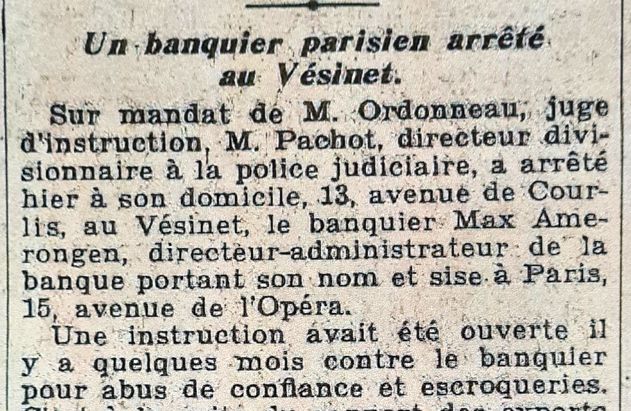 Le 6 avril 1932, toute la presse parisienne annonçait l'arrestation à son domicile du Vésinet, 13 avenue des Courlis, d'un coulissier bien connu : Max Amerongen soupçonné d'avoir détourné l'argent de ses clients pour des sommes allant de 800.000 frs à plus de deux millions. Un personnage qui ne manquait pas d'audace, fécond en idées de toutes sortes, qu'il imposait avec conviction dans son journal La Tendance, dans des billets qu'il signait « Grand-Père » qui eurent parfois quelque retentissement. [1]