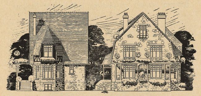 Une villa au Vésinet [4] par R. Clozier architecte D.P.L.G. et de la Préfecture de Police. Cette construction présente, vers une belle vue sur le lac [supérieur] du Vésinet, toutes ses pièces habitables, et de l’autre côté les services. Elle comprend : 1° Au sous-sol, sous toute la surface, une grande buanderie installée, pouvant servir de garage ; une chaufferie et deux caves ; 2° Au rez-de-chaussée, un grand hall desservant directement water-closet, lavabo, escalier, cuisine installée, avec paillasse de faïence ; évier, revêtement faïence, placard et garde-manger ; enfin comme réception, une grande salle à manger et un salon réunis par une cloison mobile et ouvrant sur une grande terrasse couverte ; 3° Au premier, deux grandes chambres ouvrant sur une autre terrasse, une loggia, une autre petite chambre, un 2e water et une grande salle de bains toilette ; 4° Au deuxième, deux belles chambres et deux greniers.