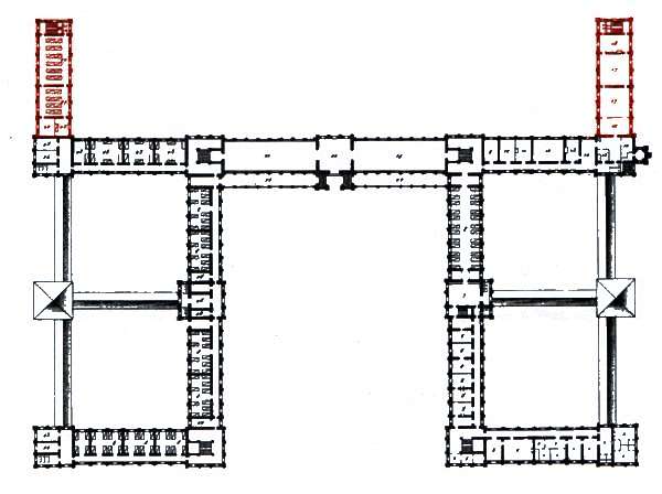 Plan d'ensemble de Eugène Laval (1866). En rouge brique, les extensions achevées par Eugène Lacroix après la mort de Laval en 1869.