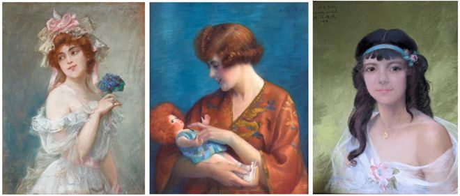 Aquarelle et pastels de Arpad de Migl Le bouquet de violettes (~1898) ; La femme à la poupée (1920) ; jeune fille au ruban bleu (1918) [5]