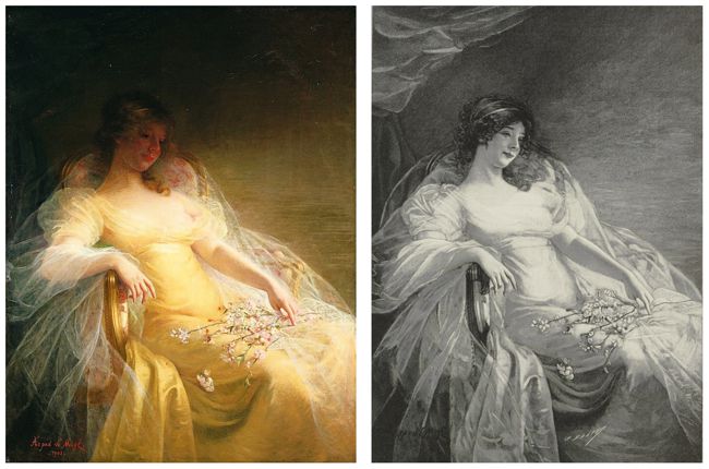 « Éveil de printemps », peinture à l'huile sur toile de Arpad de Migl (1903). Musée municipal de Cambrai et la gravure de Charles Baude publiée dans L'Illustration (26 mars 1904).