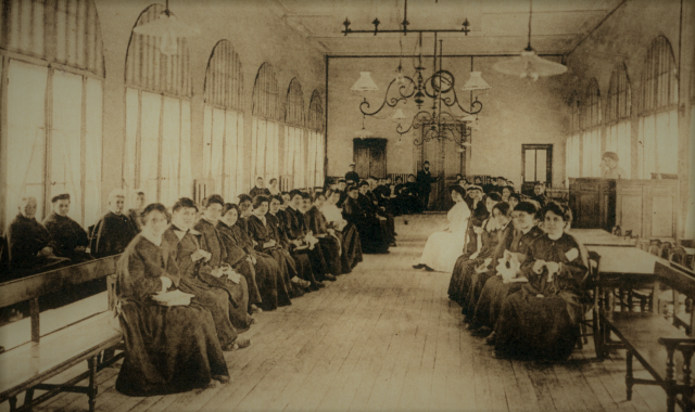 Asile national du Vésinet – Promenoir Les pensionnaires disposaient d'un uniforme (mode été ou hiver selon la période de leur séjour).