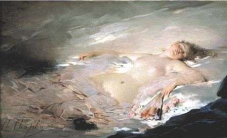 Suzanne Derval. Dans les rêves, vers 1886 huile sur toile de Ch. Chaplin (1825-1891), qui fut exposée au Louvre. Suzanne Derval avec son corps de Vénus du Titien, une tête expressive et des yeux déconcertants, est une de ces belles pécheresses qui font le bonheur des directeurs de théâtre de genre, ayant des rôles exigeant un maillot bien rempli. Aux Menus-Plaisirs, notamment, Suzanne Derval dans la Danse serpentine de Tararaboum-Revue obtint un triomphe ... [25]. ...L'huissier appelle Mlle Suzanne Derval. C'est le signal d'un véritable scandale ; le public manifeste sa joie en faisant un tapage infernal. Ah ! ah ! ouh ! oh ! assis ! chapeau ! s'écrient en chœur les agréables compagnons qui sont venus à l'audience en partie fine. Le président avoue qu'il devient difficile de conduire les débats et menace de faire évacuer. Mlle Derval se présente à la barre. Robe noire, jaquette d'astrakan, chapeau en or avec papillon tremblotant, voile blanc, attitude lasse et air profondément ennuyé. Montrant Bidard d'un signe de tête : La participation de Suzanne Derval à ce procès fut une des rares occasions publiques où elle ne put dissimuler sa véritable identité. Son audition comme témoin fut précédée de la lecture de la déposition d'une certaine Mlle Petit. A peine a-t on lu cette déposition de la Mlle Petit en question arrive en personne « pour économiser les 100 frs d’amende qui viennent de lui être adjugés. Mlle Petit n’est autre que Suzanne Derval, la sympathique Fontaine d’eau chaude de Tararaboum–Revue : Elle dépose très gentiment,sans la moindre colère, contre l’homme très comme il faut, qui lui avait parlé de dépenser avec elle 100,000 frs par mois. Elle n’avait pas exigé le mariage » comme le rapporteront le lendemain les chroniqueurs judiciaires les plus attentifs. [27] Au fait de sa notoriété au changement de siècle, Mme Derval triomphe dans les revues aux Variétés avec Max Dearly (1902), dans des reprises des opérette d'Offenbach (1904), à l'Olympia (1905) au Casino de Paris (1907) ... L'âge et l'expérience lui font une place dans des théâtres de boulevard où elle poursuit une carrière de « vraie comédienne » créant quelques pièces de Sacha Guitry (Renaissance, 1910-1912): dans Feu de paille ou encore Un beau Mariage où elle tient le rôle d'une « cocotte bien grue », pour lequel, précise le critique, « elle a toutes les qualités de l'emploi ». Elle fait aussi quelques apparitions au cinématographe, sortes de pantomimes filmées comme le Mariage de l'Amour de Daniel Riche, réalisé en 1914 par Maurice Le Forestier. Née Jeanne Emiliène Berthe Petit le 28 janvier 1865 à Paris 12e, fille d’un tonnelier, elle devient couturière et se marie avec Jules Carpentier, un vannier de Maisons-Alfort, en 1883. Mineure, donc. Mais en novembre 1889, les époux, déjà séparés, divorcent à la requête du mari. Berthe Petit vit de son côté, à Paris ; qualifiée de « défenderesse défaillante », elle n’est ni présente au tribunal, ni représentée par un avocat... Dans La Fin de Chéri – la suite que Colette a donnée en 1926 à son roman Chéri – Léa, le personnage inspiré par Suzanne Derval, n’est même plus une ancienne demi-mondaine encore coquette : elle est juste une vieille femme qui a renoncé à toute séduction, « flétrie, énorme, magnifique ». Chéri ne s’en remettra pas et se suicidera d’une balle dans la tête. Suzanne Derval, elle, a vécu bien après la parution des deux romans de Colette. La dernière inscription aux hypothèques de Cannes est datée du 29 février 1940 : c’est celle de la vente, pour la somme de 200.000 francs, de la villa de la rue Clemenceau qu’elle avait achetée en 1927. Suzanne Derval vient d’avoir 75 ans. Après ça, elle disparaît pour de bon et je n’ai pas réussi à la retrouver. Finalement, dans cette longue partie de cache-cache, elle aura eu le dernier mot. Chapeau Suzanne !