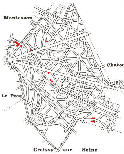 Les 15 impacts des bombes tombées sur le Vésinet le 3 mars 1942 (shv).