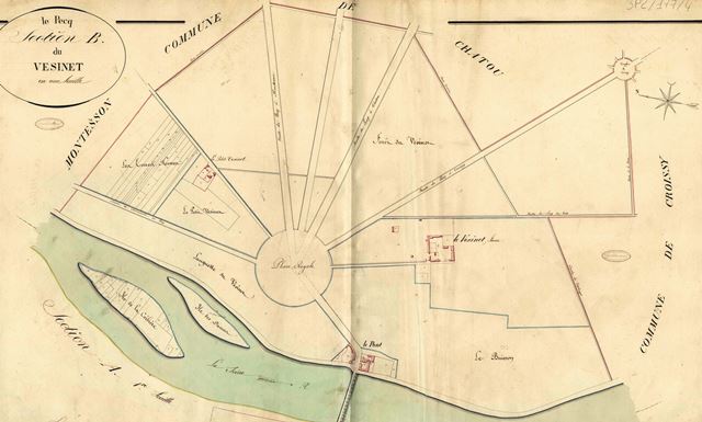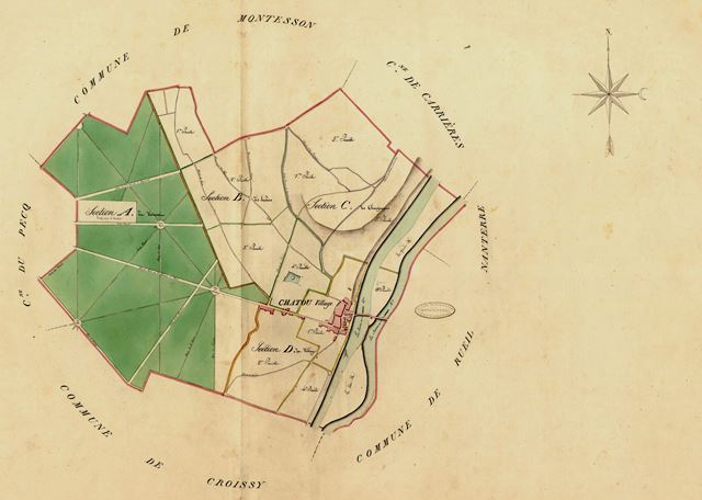 Plan cadastral de la Commune de Chatou (1820) Ici, la Table d'assemblage. Des feuilles plus détaillées sont consacrées à chaque section. La section A dite du Vésinet concerne la seule forêt ; appartenant aux Domaines, elle est non imposable.