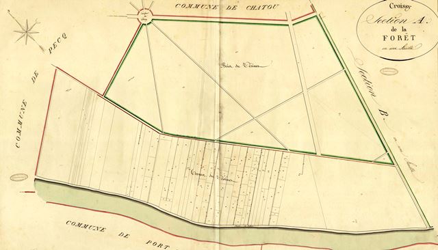 Plan cadastral de Croissy-sur-Seine (1820) -Section (A) de la Forêt. La section A dite de la Forêt comporte une importante portion de forêt, mais aussi les terres du Vésinet, terres agricoles autrefois défrichées pour la Ferme du Vésinet, au Pecq et à Croissy.