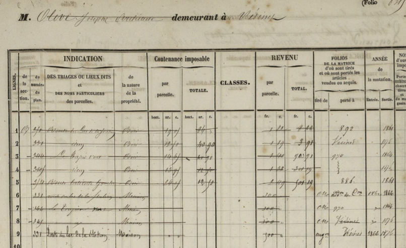 A suivre... **** Notes et sources: [1] Le cadastre n'a pas été mis en place partout en France en même temps. Il s'est étalé jusqu'en 1850. [2] Une commission extra-parlementaire du cadastre, instituée en 1891, rendra des conclusions pour la nécessité de réfection intégrale du cadastre. Une réforme partielle commencera avec la loi de 1898 instaurant notamment une répartition plus équitable des dépenses de réfection ou de révision entre l'Etat et les collectivités locales. [3] Joseph Olive apparaît aussi sur les matrices de Croissy. [4] Rapports du préfet et de la commission départementale / Département de Seine-et-Oise. La Gutenberg (Versailles) avril 1876.
