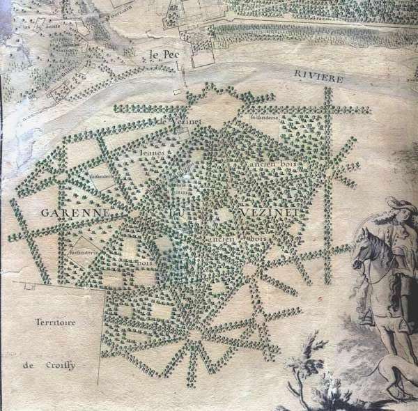 Carte en couleurs (1,52 × 1,14 m) ; Éch. 1/9.500e. Elle peut apparaitre comme un détail de la grande carte ci-dessous. La garenne du Vézinet y est représentée comme une partie de la forêt royale de St Germain. On y relève deux faisanderies, les "anciens bois" et le "jeune bois", ainsi que le Bois de la Trahison, une remise à grains (pour le gibier) et le domaine du Vézinet.