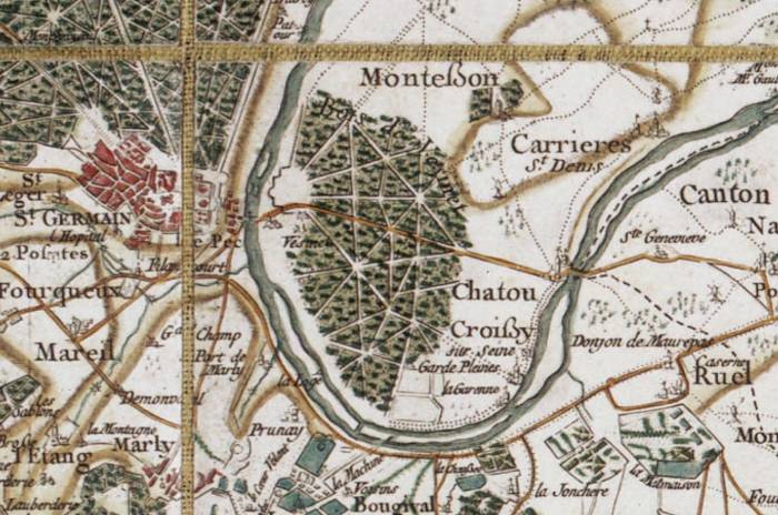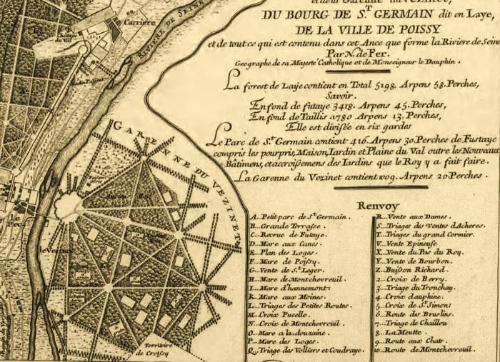1705 - Plan de la forest de Laye, et de la garenne du Vézinet, du bourg de St Germain dit en Laye, de la ville de Poissy et de tout ce qui est contenu dans cet ance que forme la riviere de Seine.