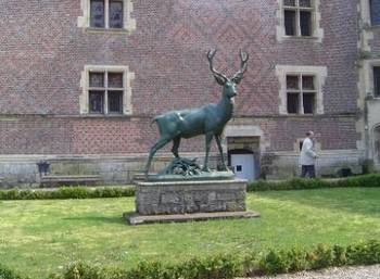 Sur le socle, légèrement plus court, la souche a disparu et le feuillage est un peu moins présent. Même si l'encolure parait un peu faible pour un bois si imposant [4] ce cerf, comme son pendant d'Amérique eut un beau succès lorsqu'il fut placé à l'entrée du Pavillon de la Sculpture à l'Ecole des Beaux Arts, comme en témoigne cet extrait d'une notice rédigée par Théodore Véron [5]: "Qui de nous en entrant à la Sculpture par la porte d'honneur, n'a pas été accueilli royalement par ces deux rois des forêts du Nouveau-Monde et de l'Europe ? En effet, à gauche et à droite, nous avons vu les deux plus beaux ruminants, qui sont représentés dans toute la splendeur de leurs majestueuses allures. À quoi bon d'écrire [sic] leurs mouvements et leurs poses naturelles ? C'est inutile, puisqu'ils sont copiés sur nature, et qu'au jardin des plantes vous pourrez les revoir, eux que vous avez déjà vus vivants dans leurs attitudes de bronze. "
