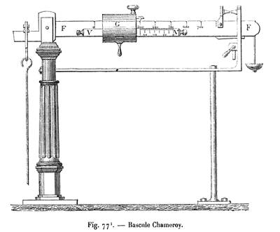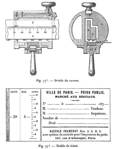 Les bascules imprimant le poids, dont l'heureuse idée est due à M. Chameroy, constructeur à Paris, rue d'Allemagne, 147, étaient déjà employées-pour le pesage public aux Halles centrales et au marche aux bestiaux de la Villette, où elles donnent d'excellents résultats. La Ville possède actuellement 10 ponts-bascules et 30 bascules portatives de ce système justement récompensé par la médaille d'or de l'Exposition universelle de 1878.