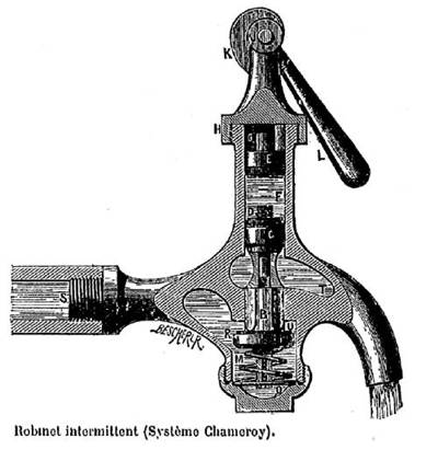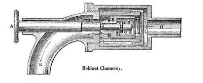 C'est un robinet économique destiné à la distribution de l'eau dans nos maisons. Il doit permettre de donner l'eau à discrétion et sans contrôle tout en mettant les abonnés dans l'impossibilité de provoquer un écoulement d'eau constant quel qu'il soit. Jusqu'à ce jour, tous les systèmes adoptés, à vis, à clef, à repoussoir, etc., peuvent être calés à volonté; nos ménagères sont là pour l'attester; or la Ville de Paris n'a guère que 450.000 mètres cubes d'eau à dépenser par jour; chaque,robinet, calculé pour fournir 45 litres par personne, peut en débiter 100.000 par le calage; ces chiffres suffisent à donner une idée de la dépense énorme d'eau qui peut se faire chaque jour en pure perte à Paris. Le robinet intermittent automatique pouvait seul obvier à ces graves inconvénients; c'est là l'intérêt tout particulier que présente le système Chameroy. Ce robinet donne de plus, l'eau sous la pression directe des conduites et peut enfin remplacer les compteurs et les jauges sans avoir leurs inconvénients.