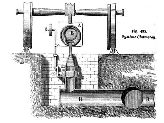 "La Compagnie parisienne, pour tous ses travaux de canalisation, paraît n'employer que le système de tuyaux en tôle et bitume provenant des usines de la Société Chameroy. La pose de ces tuyaux, qui se fait par emboîtement d'une grande précision, ne nécessite l'emploi d'aucun métal ni de matières étrangères comme pour la pose des tuyaux en fonte de fer. La longueur des tuyaux en tôle et bitume posés depuis 1838 pour l'éclairage de la ville de Paris et de sa banlieue est d'environ 1 million 200,000 mètres (1200 km).
