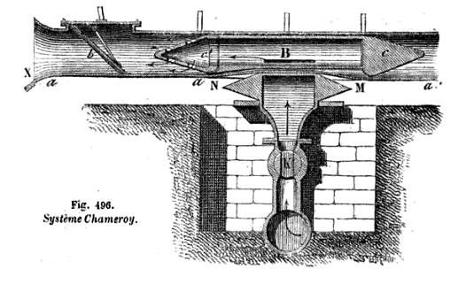 "Encore un nouveau système de chemin de fer atmosphérique. Cette fois ce n'est plus le piston qui se meut dans le tube où se fait le vide; c'est le tube lui-même, réduit à de petites dimensions, et placé sous le train, qui court à la rencontre de pistons immobiles fixés de distance en distance sur la route. C'est toujours sous l'influence de l'air, soit raréfié, soit comprimé, que s'opère ce mouvement, par un mécanisme que nous n'essaierons pas de décrire ici. Ce nouveau système est de l'invention de M. Chameroy, ingénieur. Nous persistons à nous refuser de croire à l'application sérieuse des chemins de fer atmosphériques, et nous aurions encore de la peine à nous rendre après les avoir vus fonctionner".