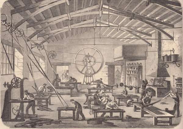 Fabrication des persiennes en tôle, dans les ateliers de M. Hippolyte Chameroy Dessin de Emile Bourdelin (Eugène Mouard, graveur) Le Monde illustré, 1861.