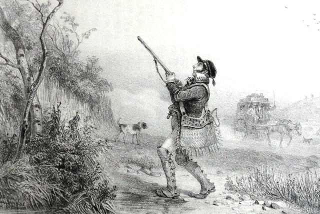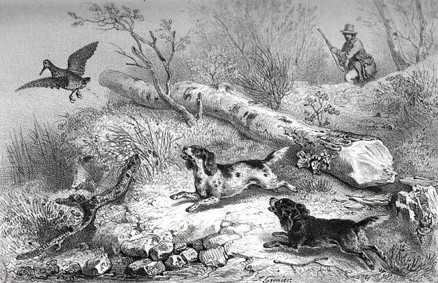Illustration — Journal des chasseurs, 1840. D'après François Grenier de St-Martin (1793-1867) : L'épicier à la chasse (1840). En exposant ces faits, connus de tous les chasseurs, en les accompagnant d'observations que tant de gens se sont déjà faites, loin de nous l'intention d'attaquer une administration que nous honorons, et où nous n'avons trouvé au besoin qu'accueil et obligeance mais nous avons pensé qu'il était de notre devoir, de notre spécialité, de l'éclairer sur ses propres intérêts, qui sont aussi ceux de la chasse en France car où se réfugiera le gibier, lorsqu'il aura été complètement expulsé des forêts royales, sa patrie d'adoption ?