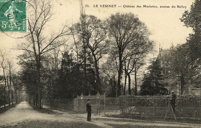 Le Vésinet - Château des Merlettes. Carte postale oblitérée en 1915 (SHV) L'article cité plus haut évoquait une Ferme des Merlettes. De l'autre côté de la route de la Passerelle prolongée, sur le territoire de Montesson, se trouvait alors une autre bâtisse originale, l'ancien pavillon du Nicaragua, vestige de l'Exposition universelle de 1889, exploité comme Ferme des Merlettes. [5] La situer avenue du Belloy au Vésinet, comme le font alors toutes les publicités, est tout à fait abusif mais à Montesson, ce lieu-dit des Terres-Neuves était alors très éloigné de la tournée du facteur tandis que celui du Vésinet y passait sans doute plus souvent ! Les photographies aériennes de l'Institut Géographique National de 1923 à 1939 illustrent bien l'évolution de ce secteur très excentré du Vésinet. La vaste propriété du Château des Merlettes conserve son intégrité jusqu'à la veille de la Seconde guerre mondiale. Puis, en quelques années, la grande bâtisse se retrouve cernée d'une demi douzaine de pavillons édifiés sur des parcelles de quelques centaines de mètres carrés. La construction du groupe scolaire des Merlettes, ouvert en 1960, parachève cette évolution et confirme l'identité du secteur : le Quartier des Merlettes.