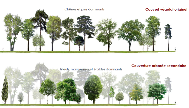 Couvertures arborées primaire (originelle) et secondaire Rapport de présentation ZPPAUP / AVAP (projets) 2010-2016. [9] Les acquéreurs de parcelles feront preuve de beaucoup plus d'imagination pour décorer leurs parcs et jardins. Grâce à eux, on peut relever çà et là quelques sujets isolés de très grande taille, de couleurs variées, d'essences exotiques : cèdres, séquoias, hêtres roux, gingkos, pins et sapins, catalpas, etc.