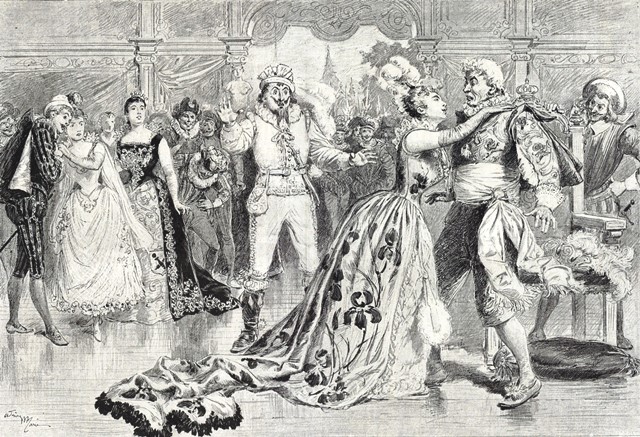Illustration d'une représentation de Barbe Bleue au Théâtre des Variétés avec plusieurs artistes de cet article (Mlle Granier, Mme Vidal, M. Baron, ...)