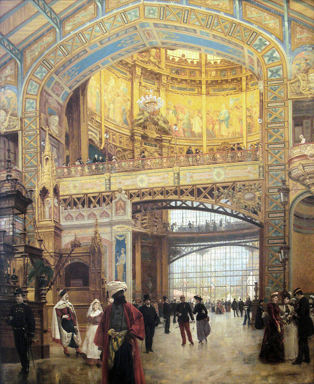 Le Palais (ou Galerie) des Machines, établi au fond du Champ de Mars, occupait toute la largeur du terrain de l’époque, c’est-à-dire englobant les immeubles le long de l’avenue de la Bourdonnais et ceux de l’avenue de Suffren, bâtis après 1900. Construit d’une seule voûte, il bat alors tous les records de construction. Dessinée par l'architecte Ferdinand Dutert (1845-1906) en collaboration avec l'ingénieur Victor Contamin, la nef de 77 000 m² au sol, de 34 700 m² de vitrage, a coûté 7 430 000 francs soit sept fois plus cher que la Tour Eiffel.