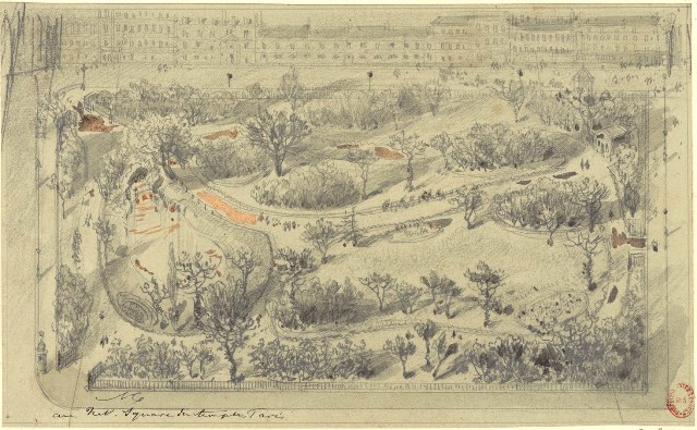 Je préfère la place Royale au square du Temple, et voici pourquoi. L'horizon de la place Royale et l'horizon du square du Temple appellent plutôt une promenade régulière qu'un jardin anglais avec ses rochers et ses ruisseaux. L'architecture de la place Royale, régulière et noble ses grandes allées de tilleuls, où l'on se promène commodément à l'ombre, la statue au milieu du jardin, les carrés sablés où les enfans jouent au soleil, tout cela s'accorde fort bien et produit un aspect harmonieux. La place du Temple est moins régulière que la place Royale. Les maisons et le marché qui l'entourent ne sont pas bâties sur le même plan mais pourtant ce sont des maisons alignées, ce sont des rues coupées à angle droit. Tout cela n'appelle pas nécessairement un abrégé de Montmorency ou de la forêt de Fontainebleau. La mode est aux rochers dépaysés, aux paysages amenés de loin, aux arbres séculaires émigrant, à 200 frs par voyageur, de la barrière du Trône à la place de la Bourse, et je me garde bien de réclamer contre tout cela. La petite vallée de Montmorency qu'on a transportée place du Temple a l'avantage inappréciable d'être de l'air et de la verdure. Je donne donc la bienvenue à la vallée qu'on loge au marché du Temple. Seulement je suis sûr qu'elle est un peu étonnée du domicile qu'on lui a fait. L'horizon environnant, c'est-à-dire la rue de Bretagne, la rue Cafarelli et les boutiques de vieilles chaussures qui bordent la rue Percée n'appelaient point nécessairement un jardin anglais.