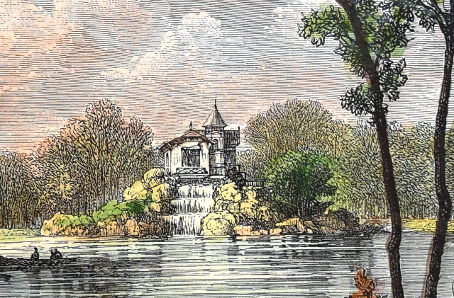 Le château d'eau photographie vers 1888 ... ... avant d'être surmonté de réservoirs supplémentaires en acier. Parmi les promeneurs qui circulent joyeusement autour de ce beau lac supérieur