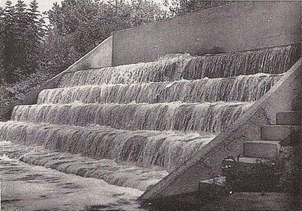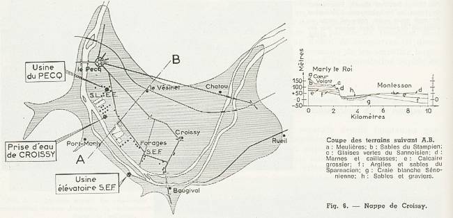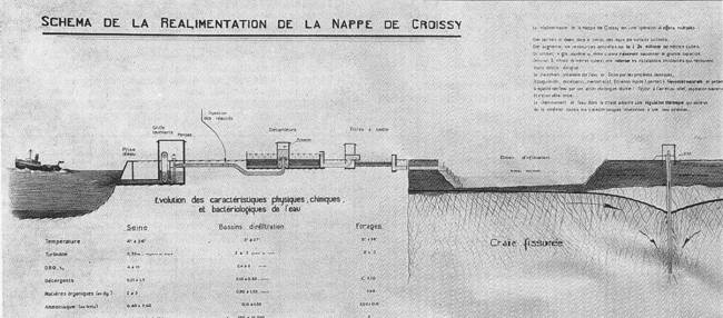 Sablière aval, cascade d'aération (SLEE) Au total, dans son état naturel, la nappe de Croissy était, au cours des dernières années, devenue insuffisantes pour alimenter les Villes et Communes qui pouvaient normalement compter sur ses ressources. En outre, la qualité de l'eau se détériorait progressivement par suite des infiltrations forcées de la Seine provoquées par l'abaissement du niveau d'eau. La « réalimentation » de la Nappe de Croissy [3] Au cours d'une réunion d'information, sous la présidence de M. Manière, Sous-Préfet de St-Germain-en-Laye, les représentants des huit communes de la boucle de Croissy réunis à l'usine élévatoire du Pecq, adoptèrent, en 1964, le principe de la réalimentation de la nappe de la Craie. Cette opération, qui consiste à enrichir artificiellement un gîte aquifère en y introduisant par infiltration dans des bassins spéciaux de l'eau de rivière préalablement traitée, apparaissait comme la seule solution à envisager. Une adduction d'eau lointaine, telle que le projet des Vals de Loire, était financièrement tout à fait impossible. Faute d'eau souterraine, il est inévitable de s'adresser aux eaux de surface, c'est à dire, dans notre région, à la Seine. Mais la Banlieue Ouest de Paris a le fâcheux privilège d'être immédiatement en aval de la capitale, ce qui veut dire que la Seine y est gravement polluée par des déversements massifs d'eaux usées. A l'étiage, il est exclu d'utiliser directement son eau, même avec les procédés d'épuration les plus modernes. Par contre, il avait été constaté depuis longtemps, que l'introduction accidentelle, pendant les crues, de quantités d'eau importantes dans les sablières, se traduisait par un relèvement des niveaux sans que la qualité bactériologique de l'eau en soit aucunement affectée.