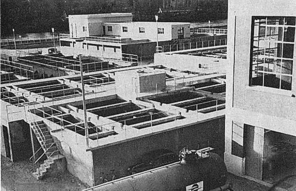 A droite, le bâtiment des réactifs. Réception de sulfate d'alumine en solution. (SLEE) Déclaré d'utilité publique par arrêté préfectoral du 21 juillet 1965, le projet a été, par avenants aux traités de concession, accepté par les huit communes intéressées : Le Vésinet, Bougival, Carrières-sur-Seine, Chatou, Croissy-sur-Seine, Montesson, Le Pecq, Port-Marly. A l'heure actuelle, la majeure partie des travaux prévue, dont le coût approchera de 20 millions de francs (2 milliards de francs légers) a été réalisée.