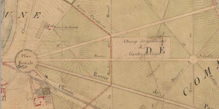 Sur le détail ci-dessus, on peut noter la ligne de chemin de fer traversant le domaine de la ferme du Vésinet qui retrouvera son intégrité en 1847, lorsque sera ouverte la déviation du chemin de fer atmosphérique. On peut voir aussi l'emplacement précis du champ de manoeuvre des Gardes du Corps où le jeune Paul de Lavenne, pas encore comte de Choulot , est peut être venu en exercices dans sa jeunesse militaire. C'est un rectangle de 575 x 200 m. On peut consulter en détail cette carte sur le site de Institut d'aménagement & d'urbanisme de la région Ile de France (rubrique cartes anciennes) parmi les cartes interactives **** [1] Un dessin-minute est un croquis ou une esquisse préliminaire réalisée sur le terrain par les cartographes. Il s'agit d'un document de travail rapide qui capte les principaux éléments géographiques et topographiques d'une zone avant de créer une carte plus détaillée et précise en laboratoire. Le dessin-minute permet de noter les observations et de collecter les données nécessaires pour la production de la carte finale.