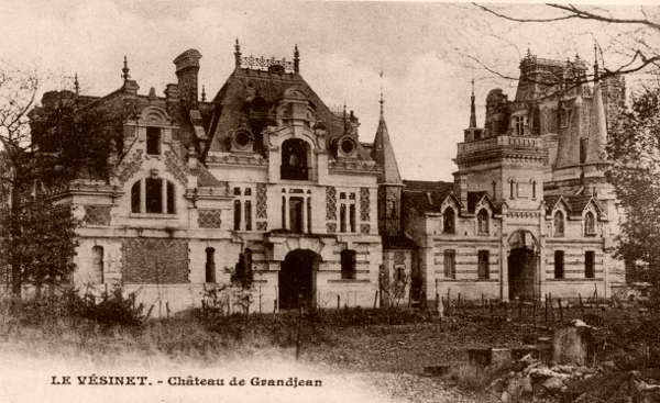 [3] François Nicolas Omer Grandjean, négociant en grains, domicilié avenue du Belloy, avait fait construire, en 1882, cette gigantesque folie sur un des multiples terrains qu'il avait acquis au Pecq, à Montesson, à Chatou, avant la création de la commune du Vésinet. En raison de difficultés financières, le chantier fut arrêté et le bâtiment resta en l'état durant plus de vingt ans. Entre 1885 et 1891, on trouve sa trace dans de nombreux actes (vente forcée de terrains, procès multiples, jusqu'en cassation). Enfin, en 1904, le Château Granjean fut démoli.