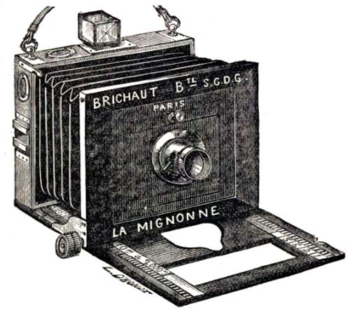 « La légèreté de l'appareil désigné sous le nom de la Mignonne permet de l'employer à la main ou en bandouillère, même pour le format 18 x 24 qui ne pèse que 1,200 kg. La planchette évidée où se trouve encastrée une double crémaillère, sur laquelle se meut l'avant de la chambre pour la mise au point, se relève lorsque le soufflet est replié, et l'appareil ainsi fermé présente une épaisseur de 52 mm. » Présentation faite par M. Brichaut, à la séance du 5 avril 1895 de la SFP. **** Notes et sources :