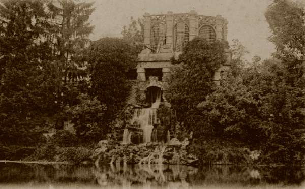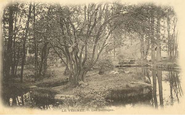 Une averse de courte durée vient refroidir pour quelques instants l'ardeur des opérateurs; mais bientôt le ciel s'éclaircit, et c'est par une lumière assez favorable qu'ayant remonté le petit cours d'eau qui se jette dans le Lac Inférieur on parvient à une série de cascades sous bois qui offrent des sujets charmants à certains d'entre nous ; le chemin se poursuit le long de la rivière où s'arrêtent encore quelques opérateurs. Mais il faut songer à l'heure du déjeuner : le retour au Restaurant de la Gare s'effectue par un soleil superbe ; le repas des plus gais redonne des forces et du courage aux Excursionnistes. C'est par un temps relativement beau que l'on traverse la ville pour arriver au Lac Supérieur où des ruines factices qui dissimulent des réservoirs forment un ensemble intéressant. Le réservoir, conçu comme une ruine (factice), plusieurs fois modifié, agrandi, surélevé... La rivière sortant de ce lac présente plusieurs cascades devant lesquelles s'arrêtent des amateurs, et vient se jeter dans le Grand Lac qu'entourait autrefois l'Hippodrome du Vésinet. La grotte, mal éclairée à cette heure de la journée, offre moins d'intérêt que les rives de ce lac autour duquel se braquent de nombreux objectifs.