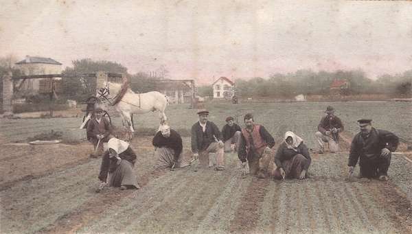 Les rives de ce même lac et son déversoir tentent encore plusieurs amateurs. Un petit crochet dans les cultures maraîchères de Croissy, qui se trouvent sur la frontière du Vésinet, donne occasion à une partie de la troupe de prendre des instantanés de travailleurs champêtres tirant la carotte.