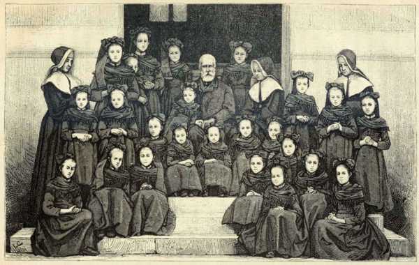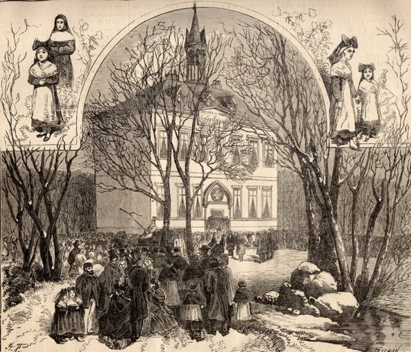 La maison est très-bien conditionnée. La cuisine et le réfectoire sont au sous-sol. Au dessus, la classe, spacieuse, bien propre, bien aérée, bien éclairée; en face, un ouvroir, où les enfants apprennent à travailler aux différents genres de coutures, depuis midi jusqu'au soir, avec intermittence de récréations, bien entendu. Au premier étage, se trouvent les dortoirs, d'une admirable propreté, tout coquets de blancheur, parfaitement agencés pour communiquer dans un appartement spécial pour la toilette, communément appelé lavabo. Au-dessus de chaque lit, un écriteau porte les noms et qualités des personnes charitables qui en sont les fondatrices [2]. L'inauguration de l'Orphelinat eut lieu le dimanche 5 décembre 1875, en présence de M. le comte d'Haussonville, président de la Société de protection des Alsaciens-Lorrains. A deux heures, la Maréchale de Mac-Mahon, comme elle avait bien voulu le promettre, vint à l'Orphelinat. Reçue par M. le comte d'Haussonville, elle visita l'établissement dans tous ses détails, et exprima toute sa satisfaction. Les petites filles étaient rangées sur l'escalier intérieur, revêtues de leur costume national.