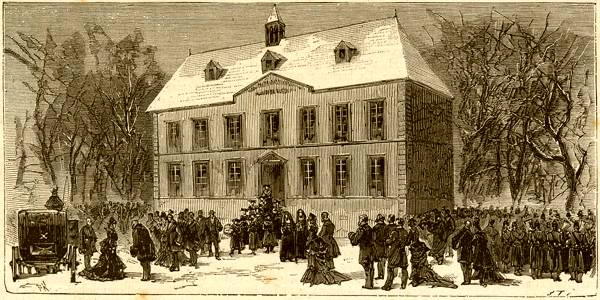 Deux représentations de l'Inauguration de l'Orphelinat Alsacien-Lorrain du Vésinet - Arrivée de la Maréchale de MacMahon Parmi l'assistance, très-nombreuse, malgré la rigueur de la saison, se trouvaient, outre M. le comte d'Haussonville et M. de Naurois, fondateur de l'Asile, M. le vicomte d'Haussonville fils, député ; M. le préfet de Seine-et-Oise et Mme Limbourg; M. Pallu, maire du Vésinet, et Mme Pallu; MM. Rumpler, Maunebarguer, de Billy, Guynemer, Hepp, membres du Comité, etc., etc. Notes : [1] Dans ce texte « hagiographique » sur la vie et l'Oeuvre de Edouard de Naurois, il était impensable de faire allusion au rôle de la Comtesse de Chabrillan alias Mogador dans la décision de M. de Naurois de consacrer le terrain du Vésinet (additionné d'une somme importante) à la fondation d'un établissement de bienfaisance. Naurois s'était engagé auprès du Comte d'Haussonville à ne jamais dévoiler le rôle de la sulfureuse artiste et femme de lettre. [2] Les 15 premiers « lits » d'une valeur de 8000 frs chacun, ont été financés par MM. le duc d'Aumale, le comte de Greffulhe, la comtesse de Chambrun, Mme Orphée Erard, MM. de Talleyrand-Périgord et Chalais, de Bourdon de Vatry, de Valbezen, le marquis de Reigecourt, et enfin M. Fardoux qui a fondé six lits à, son nom, la somme dont il a disposé en faveur de la Société des Alsaciens-Lorrains, s'élevant à près de 120.000 frs.