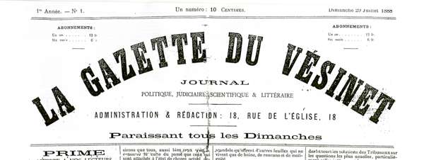[1] Dans le numéro du 21 octobre 1868, on pouvait lire dans le Journal de Seine et Oise: La Gazette du Vésinet, ayant acquis le droit de parler politique, se trouve armée de toutes pièces pour obtenir le résultat qu'elle se propose. Son premier numéro est bon et fait bien présager de la suite. Des questions d'intérêt local, des anecdotes, des comptes-rendus, de la causerie, rien n'y manque ... Espérons que les lecteurs ne manqueront pas davantage?" En août 1869, la Gazette cessait de paraitre.