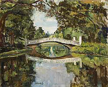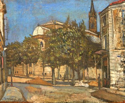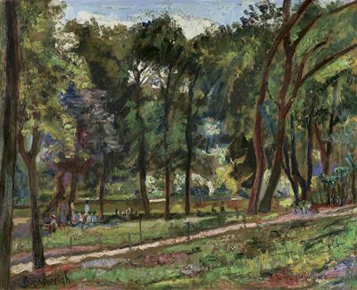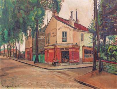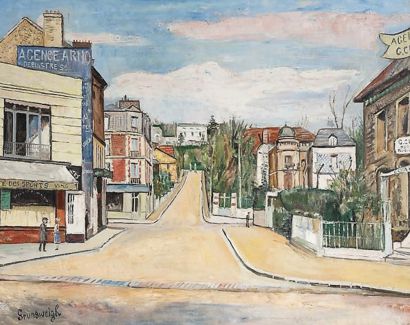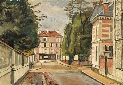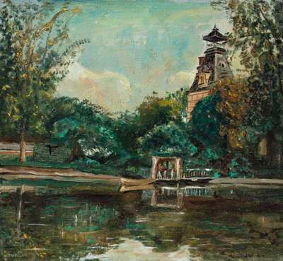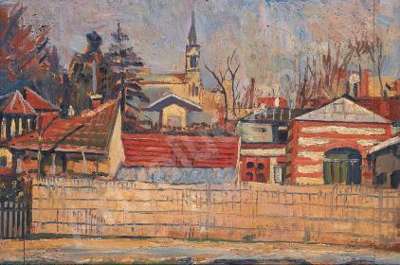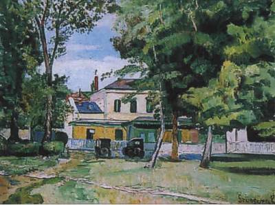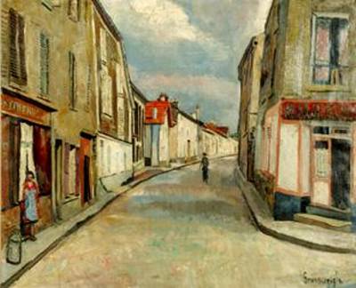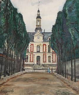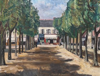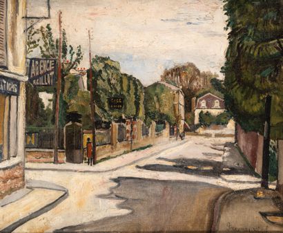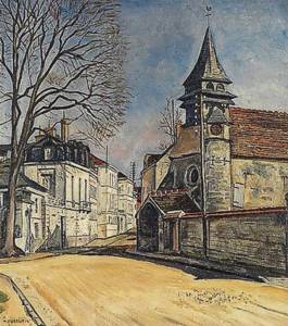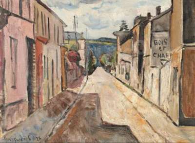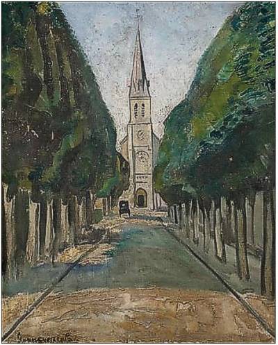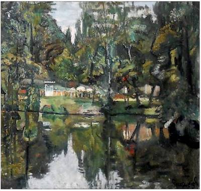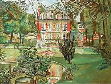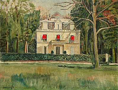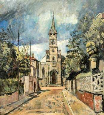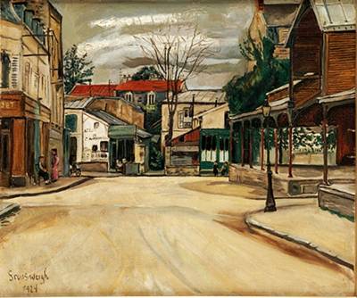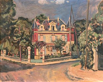 Grunsweigh (1925) La Fête au Village sur la place du Marché. Aussi, Grunsweigh installe, à la salle des Fêtes de la mairie du Vésinet, du 5 au 18 septembre 1933, une exposition de ses œuvres. Grunsweigh est un très bon peintre, dont le Salon d’Automne et les Tuileries nous ont montré d’attachants portraits, surtout de jeunes filles. C’est aussi un traducteur avisé et ingénieux de la banlieue de Paris, notamment du Vésinet, dont il a noté avec beaucoup de talent des rues tranquilles aux maisons peintes et des grands arbres, qui, de jardin en jardin, créent l’impression d’un grand parc, par dessus les murs égayés de fleurettes sauvages, balançant jusqu’au fond de l’horizon leurs panaches. Ses natures mortes sont précises et expressives, il apprécie les couleurs fortes et les textures dynamiques. [16] Son travail a été principalement influencé par les peintres de la première École de Paris dont il a fait partie et où il fut l'ami de Chaïm Soutine, Michel Kikoine et Pinchus Krémègne. Il milita à la Ligue pour le repos sabbatique en France et en Algérie. Grunsweigh, qui y a vécu durant plus de vingt ans, a beaucoup représenté les rues du Vésinet, leurs maisons de ville, les places, mais aussi quelques villas au milieu de leur parc, le lac des Ibis, le lac et le pont de Croissy (que l'on présente sous le titre " Route de Montagne" ), le Cinéma Le Select, près de la gare (plusieurs fois), la gare elle-même (aussi plusieurs fois), l'église, le temple, les pelouses... Il donne ainsi de la couleur à nos vieilles cartes postales. On notera, au passage que les peintures sont présentées dans les ventes avec des titres des plus fantaisistes. [18] Grunsweigh a aussi représenté les villes voisines, par exemple, ci-dessous, Croissy, son église et la chapelle du Prieuré et à Chatou (à droite) la mairie.