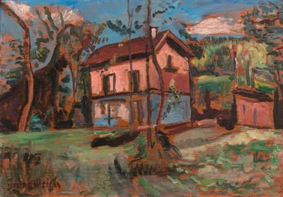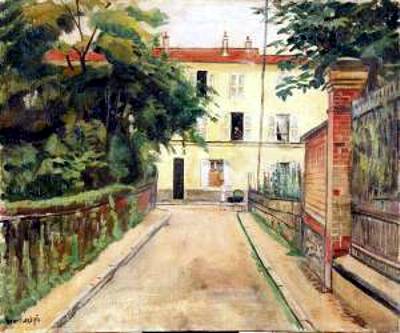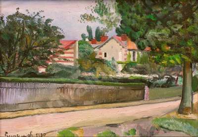 Les habitants célèbres du Vésinet > Nathan Grunsweigh (1880-1956) Nathan Grunsweigh peint le Vésinet A la Galerie Manuel frères, en septembre 1923, sont réunies des œuvres de Grunsweigh. Ce sont « d’intéressants paysages de l’Île-de-France, des scènes d'intérieur d’une simplicité de bon aloi » et, surtout, deux portraits d’hommes « d’une robuste loyauté ». C'est un artiste sérieux, qui aime son art et le sert du mieux qu'il le peut, en dehors des spéculations hasardeuses. Il ne cherche pas sa route hors des domaines logiquement picturaux. Le naturalisme de sa peinture n’est cependant pas photographique et ne tombe ni dans la fadeur ni dans le convenu. Il voit clair et s’exprime avec aisance, dessinant strictement et se plaisant souvent à souligner les formes par un trait vigoureux. Sa palette est savoureuse, il peint dans une gamme généralement assez sombre, mais que sait réveiller, là où il le faut des tons francs et vifs. Les paysages de Paris l'ont tenté, les paysages faubouriens surtout, il en détaille avec minutie le pittoresque, s'attachant à donner le vrai visage des façades couvertes d’enseignes et d'affiches, dégageant bien le caractère prenant des décors où se déroule tant de petites existences, tant de petits charmes quotidiens, de petites joies et de petites misères. Mais cela, c’est de la littérature et Grunsweigh ne cherche pas à en faire, il reste avant tout peintre. Connaissant les moyens dont il dispose, il les utilise de son mieux sans chercher à forcer son talent. [1] A la Galerie Pierre, en 1926, Grunsweigh expose une vingtaine de paysages de la banlieue parisienne et des natures mortes. C'est un artiste sincère, consciencieux et savant. Il s'est démontré excellent peintre de figures. Puis il a été séduit par des aspects de banlieues parisiennes et il a ajouté une note inédite à la peinture des zones suburbaines. Tandis que les peintres parisiens sont surtout soucieux d'en donner [d'après Raffaelli] l'impression de tristesse et même de détresse, Grunsweigh a surtout été frappé par tant de menus efforts pour créer du joli, pour entourer d'arbres une facade de briques, blanche et rose, et même un mensonge de briques obtenu par de la couleur sur de la caillasse. Il a noté avec un soin épris, les charmes de petits jardins qui se continuent de murs en murs et semblent, par l'accumulation des frondaisons, se multiplier en grand parc dans l'horizon. Grunsweigh. Ses œuvres, fines et nuancées, représentent des rues de banlieue, des petits jardins des environs de Paris, de ces paysages où il semble que la Ville et la Campagne luttent pour une suprématie. C'est là qu'il vit, dans une petite maison, dans une triste rue. Le matin, les gens vont travailler à Paris et les rues sont vides le soir, les silhouettes rentrent par le train, et ça continue. Ça n est pas gai. Mais Grunsweigh est un consciencieux, un homme simple, et parfois un gris léger, un joli gris argenté, luit comme un reflet de perle dans son œuvre mélancolique.[3] Il a exposé dans de nombreuses galeries et divers Salons dont, à Paris, au Salon d'Automne au Grand Palais (en 1921, 1924, 1926, 1937), au Salon des Tuileries (en 1923 et 1936), et au Salon des Indépendants (1926). [4]