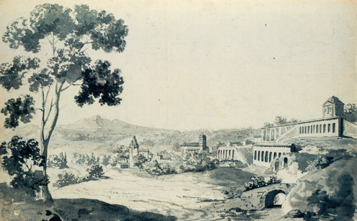 Ruines du Château neuf de Saint-Germain-en-Laye, et l'église St Vandrille au Pecq - dessin, 1818