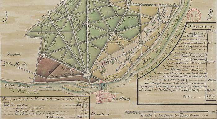 Plan dressé par Main, premier arpenteur de la Maitrise des Eaux & Forêts de St Germain en 1783 (détail) On peut y voir les 32 bornes de 1751, la nouvelle route dite de la Princesse de Conty, les défrichements de 1779 pour la Ferme du Vézinet et ceux prévus le long de la route de la Borde (qui resteront au Pecq et à Mmontesson lors de la création de la Commune du Vésinet).