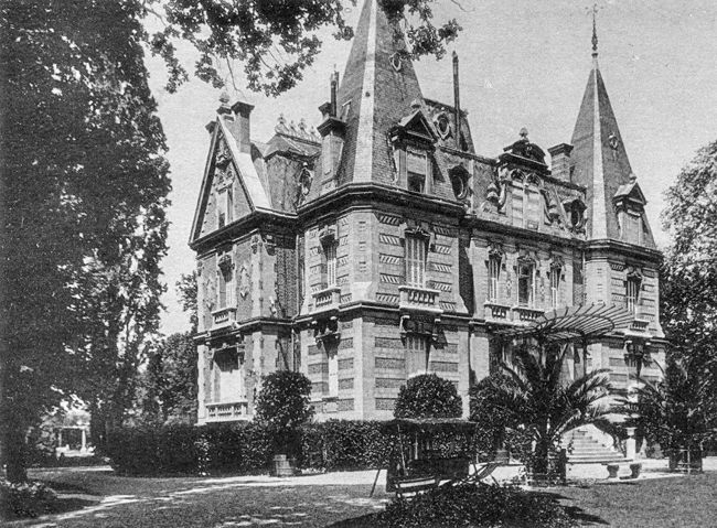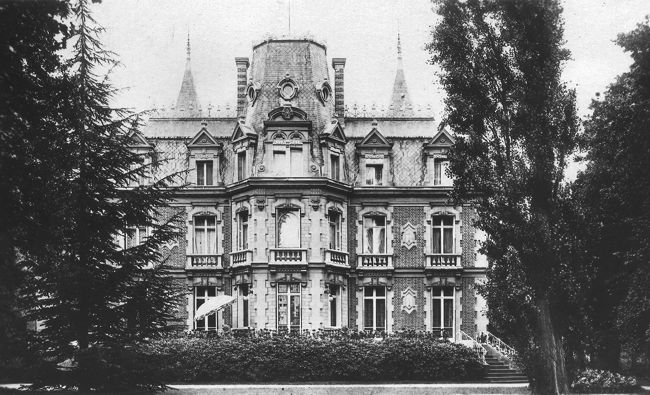 Le Beau Chêne (façade postérieure). La façade postérieure, reprenant un schéma classique, s'enfle dans sa partie centrale d'un large avant-corps occupé par le grand salon. Bâtie sur une très grande parcelle, c'est l'œuvre la plus importante de Gilbert au Vésinet et chacune de ses façades a fait l'objet d'une recherche particulière, sur le thème du brique et pierre. L'élévation principale est flanquée de deux pavillons carrés, formule que l'on rencontre dans les maisons de caractère moderne dès les années 1870, couverts de flèches très élevées. A l'étage, les angles des pavillons sont coupés, procédé déjà rencontré au 1, rue du Marché. Le centre de la façade est marqué par un léger avant-corps amorti par une composition pyramidante autour d'une lucarne à baies géminées en plein cintre. On relève des accents véritablement maniéristes dans le mouvement du fronton et surtout dans la disposition des ailerons qui calent la composition. La façade postérieure, reprenant un schéma classique, s'enfle dans sa partie centrale d'un large avant-corps occupé par le grand salon. On note une excroissance de couvertures tout à fait étonnante. Les façades latérales, curieusement, présentent un pignon découvert là où l'on attendrait un toit brisé comme pour le reste l'édifice. Mais le pignon fait l'objet d'un traitement particulier. Interrompu par la corniche qui dessine une sorte de fronton, le décor, plus que jamais, emprunte à la Renaissance: souches de cheminées, lucarnes, culots.., jusqu'au motif de cordelière qui encadre le fronton. [1] Le premier propriétaire figurant sur le cadastre (1893) pour la propriété que nous appellerons Beau-Chêne [2] est Madame Vve Edouard SALLES née Blanche Maximilienne Catherine DEVADE. La propriété compte alors, outre le « château », un kiosque antique, une serre, un hangar avec un réservoir et des communs. Elle occupe les parcelles 210 à 214 du cadastre, ce qui correspond aux lots 56 à 60 de l'îlot 10 du plan de lotissement général de MM. Pallu & Cie (environ 13 400 m²). Son défunt mari, Edouard Louis Eugène SALLES (1829-1884) était négociant. En réalité, Mme veuve SALLES n'a pu profiter de cette somptueuse aquisition puisqu'elle est elle-même décédée le 8 février 1892 à son domicile parisien. C'est un de ses deux fils, Georges Maximilien Edouard SALLES, qui une fois les questions de succession règlées (1898) apparaitra comme propriétaire et fera de la villa son domicile. La fiche cadastrale mentionne pour 1923 le nom de la nouvelle propriétaire : Mme Vve VERSCHOORE, née Marie-Louise Mathilde NUYTTENS, rentière. Joseph Destombes, 15 villa Beau-Chêne au Vésinet Une forme d'adresse qui ne correspond à rien de compréhensible sur le terrain. Mardi 1er octobre (1929) en l'église Ste Marguerite du Vésinet (Seine et Oise), a été célébré, au milieu d’une très élégante assistance, le mariage de Mlle Denise Destombes, fille de M. Joseph Destombes, l’industriel bien connu, et de Mme née Verschoore, avec M. Ferdinand Loicq, fils du grand industriel belge. La bénédiction nuptiale a été donnée par Mgr Lecomte, évèque d’Amiens, oncle de la mariée, qui a prononcé une éloquente allocution. Après la cérémonie religieuse, M. et Mme Joseph Destombes ont donné aux nombreux invités une brillante réception dans leur château, Beau Chêne, qui a duré tard dans la soirée. Un an plus tard (août-septembre 1930) c'est Joséphine BAKER qui, dans la presse, sera associée à ce lieu. De nombreux articles leur seront consacrés – à Joséphine et à Beau Chêne – contribuant à forger l'image de l'artiste en route vers la postérité. Un des premiers à décrire la vie de Joséphine à Beau Chêne est Marcel Sauvage, l'auteur avec Joséphine des Mémoires de celle-ci [4]. ... allez au Vésinet, villa Beau-Chêne, c'est là que Joséphine Baker passe, dans le calme, ses derniers jours de vacances. La Vénus noire, ainsi qu'on l'a surnommée, remontera, en effet, sur les planches, à la fin du mois, au Casino de Paris où elle doit chanter en français Ma Tonki-ki, ma Tonkinoise... conduire à l'allure endiablée qui lui est propre une revue à grand spectacle, pleine de plumes et de fusées, et chaque soir — en fin de compte et de sketch — se faire manger par une panthère, à l'ombre d'un cocotier tragique... En attendant, Joséphine surveille ses tomates, ses ananas, ses poires d'hiver, donne à manger elle-même, deux fois par jour, à sa basse-cour — et quelle basse-cour — et prend soin que l'eau de son cresson qui pousse dans une cuvette de ciment soit à bonne température ... Joséphine est une fermière modèle. Cette artiste, cette grande, très grande artiste, qui, pour moi — en dépit des moqueries dites spirituelles et des attaques qui se voudraient méchantes et ne sont que stupides — incarne toute la poésie d'une époque désarticulée, n'est pas autre chose qu'une petite paysanne. Ce qui la passionne, ce n'est point une question de robes, de projecteurs, de pas de danse, d'auto ou de fourrures, mais sa dernière couvée de canards, mais la taille d'un pommier, la santé d'une vigne. Joséphine Baker, au Vésinet, vit, comme elle a toujours souhaité vivre, près de la terre et c'est là, précisément, le secret de sa personnalité. Elle est simple et diverse comme la terre qui donne en se jouant, des fleurs et des fruits. Joséphine, petite fille élémentaire et magnifique, passe des journées à regarder, au milieu d'une pelouse, un jet d'eau grandir et scintiller sur lui-même, retomber dans un miroitement qui décompose en gouttelettes ardentes les sept couleurs de l'arc-en-ciel... Son plus grand plaisir à Joséphine, c'est d'écouter la minuscule cascade qui murmure sur les mousses d'un rocher artificiel. Et quel bonheur de recenser, l'un après l'autre, les paniers de nénuphars multicolores dans le filet d'eau qui serpente au mi