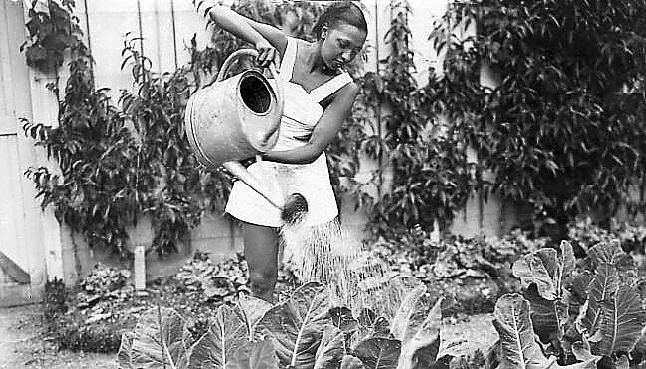 Joséphine Baker au Vésinet (1930) ... le jardin potager où elle va dix fois par jour « regarder pousser » fruits et légumes, ramasser des escargots, qu'elle emporte joyeusement à sa grande famille de poules grises, de canards beiges, de lapins angoras, de tourterelles... Tiré d'une série de photographies parues dans Pour Vous, juin 1936. Quelques jours plus tard, c'est Paule Malardot, une journaliste qui écrivait dans les magazines féminins d'avant guerre et qui sera récompensée par le prix des Deux Magots en 1946 (elle épousera bien des années plus tard le même Marcel Sauvage cité plus haut !) qui fait le déplacement au Vésinet pour le compte de La Femme de France. La « bicoque » [le mot est de Joséphine] où elle se repose entre les dernières répétitions au Casino de Paris (où elle est vedette de la nouvelle revue Paris qui remue) et où elle adore recevoir des amis, est, près de Paris, une splendide propriété entourant une grande villa de style Renaissance. Certes, la danseuse noire aime les haltes au tennis, les folles gambades sur les pelouses avec ses chiens et ses chats, les promenades dans le parc où l'on peut traverser d'un saut la petite rivière qui circule en méandres à travers des bassins et des cascades, glisse sous des ponts rustiques comme dans un décor de jardin japonais... Mais ce qu'elle, préfère encore de « Beau-Chêne », c'est le grand verger, les serres avec leurs étranges plantes exotiques et leurs ananas, le jardin potager où elle va dix fois par jour « regarder pousser » fruits et légumes, ramasser des escargots, qu'elle emporte joyeusement à sa grande famille de poules grises, de canards beiges, de lapins angoras, de tourterelles...[6]