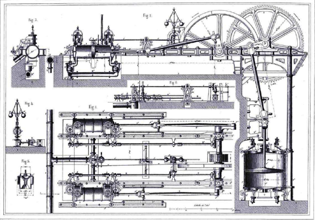 Chemin de fer atmosphérique de Saint-Germain, machines horizontales motrices. Figure 1: Plan général vu en dessus montrant les deux machines accouplées et leur transmission de mouvement. Figure 2: Coupe verticale de l'une des machines et sa pompe. Armengaud Aîné, Chemins de fer atmosphériques. Publication industrielle des machines, outils et appareils les plus perfectionnés et les plus récents employés dans les différentes branches de l'industrie française et étrangère, 1848. Planche 12. © Société d'Encouragement pour l'Industrie nationale, Paris. Quelques jours plus tard, c'est au tour du Ministre des transports de visiter ce chantier de prestige. A cette occasion, on apprend que les tubes pour la portion qui s'étend entre le bois du Vésinet et Nanterre n'ayant pas été livrés, la compagnie a été obligée d'établir provisoirement une station au Vésinet, afin de commencer une exploitation régulière de la partie terminée vers les premiers jours du printemps. Les convois partant de Paris viendront alors, remorqués par des locomotives, jusqu à ce point et de là, ils seront amenés jusqu'à la gare du château, située sur le plateau, par la force atmosphérique. ...Il faut dire, du reste, que ces 2.200 m de chemin de fer complètent tout à fait le chemin en l'amenant sur la hauteur où se trouve la ville de Saint-Germain et présentent l'épreuve la plus complète du système puisque la voie suit une inclinaison graduée depuis 0 jusqu'à 35 millimètres de pente par mètre, rachetant ainsi sur une longueur de 1,916 mètres seulement une différence de niveau de 51,29 m. La rampe la plus forte, celle de 0,035 m existe sur une longueur de 1,000 m. Le diamètre du tube propulseur actuellement posé est de 0,63 m intérieurement ; les deux machines pneumatiques de Saint-Germain se composent de deux paires de cylindres dont les pistons ont deux mètres de course, 2,53 m de diamètre, à une vitesse de 0,40 m/s. Ils épuisent huit mètres cubes d'air par seconde ou dans un tour complet de l'engrenage qui est monté sur l'arbre de leurs manivelles, le nombre énorme de 80 mètres cubes d'air. Deux paires de cylindres à vapeur les mettent en mouvement, leurs pistons ont 2 mètres de course, 0,80 m de diamètre et 2 m/s de vitesse. La vapeur engendrée dans douze chaudières chauffées par six foyers, fonctionne à six atmosphères avec détente pendant les 9/10e de la course des pistons, et agit enfin par sa condensation. Un vide de 0,35 m s'obtient en une minute environ ; il monte ensuite successivement à 40, 50 et même 65 cm pendant la marche du convoi et au fur et à mesure que le convoi approche des machines fixes. [6] Le dimanche 24 janvier, six convois montèrent à la gare du château. Ils étaient composés de 8 à 9 voitures en plus du wagon directeur. Le signal de la mise en marche des machines fixes était donné aux mécaniciens par un télégraphe électrique partant de la station du Vésinet et arrivant dans la salle des machines. Un vide de 0,35 m s'obtient en une minute environ ; il monte ensuite successivement à 40, 50 et même 65 cm. pendant la marche du convoi et au fur et à mesure que le convoi approche des machines fixes. L'ensemble de l'organisation du chemin, et surtout les machines à vapeur, « les plus parfaites qu'on ait vues jusqu'à ce jour, font le plus grand honneur à M. Flachat, et lui ont valu les félicitations des savants » qui s'étaient donné rendez-vous dimanche au chemin de fer atmosphérique.