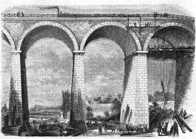 Construction du viaduc du Pecq (1846) Un des éléments d'une succession assez spectaculaire d'ouvrages d'art, concentrée sur un parcours de moins de quatre kilomètres. L'illustration, 29 août 1846. Première mondiale, les essais de traction par le vide entre le bois du Vésinet et le plateau de Saint-Germain purent commencer en janvier 1847, un mois environ avant les premiers essais atmosphériques sur la ligne de Brunel en Angleterre. Une expérience du plus haut intérêt a eu lieu jeudi sur le chemin de fer de Saint-Germain. Les travaux d'art et la pose de la voie étant entièrement terminés entre le bois du Vésinet et la gare établie sur le plateau du parterre, l'essai d'une nouvelle machine locomotive d'une grande puissance a été fait en présence de MM. Adolphe d'Eichthal, Emile et Isaac Pereire, Clapeyron et Rouen. La machine était conduite par M. Eugène Flachat, ingénieur de la compagnie, qui a dirigé tous ces travaux avec un talent remarquable. Au personnel supérieur de la compagnie, s'étaient joints M. Baude, ingénieur en chef des ponts et chaussées, et M. Combe, ingénieur en chef des mines. La pente de 35 millimètres, pente sept fois plus forte que celle qui règne entre Paris et Versailles, a été franchie par la machine, avec le convoi qu'elle remorquait, à une vitesse de 36 à 40 kilomètres à l'heure. Les nombreux ouvriers avaient préparé des drapeaux et des fleurs pour cette inauguration improvisée qui avait attiré sur les bords du chemin un grand concours de curieux. La surprise de la foule a été grande, lorsqu'on a vu cette puissante machine, qu'on a nommée Hercule, arriver avec la plus grande facilité sur le sommet du plateau de Saint-Germain, que l'on avait considéré jusqu'à ce jour comme infranchissable. Cette expérience est très importante pour l'avenir des chemins de fer. C'est un nouvel obstacle qui vient de disparaître devant la puissance de la vapeur, qui, aujourd'hui plus que jamais, peut être considérée comme la reine du monde. M. Flachat a reçu les félicitations de tous les hommes spéciaux qui assistaient à cette expérience, non-seulement pour le progrès qu'elle constatait, mais pour la nature des travaux d'art et la promptitude remarquable avec laquelle, malgré leur énorme importance, ils avaient été exécutés. [3] Six mois plus tard, les tubes de propulsion étant en place, les essais de la traction atmosphérique ont pu débuter avec succès. De nouvelles expériences destinées à comparer le système atmosphérique à la traction à vapeur classique sont réalisées, de nouveau avec l'Hercule. Si, en juin 1846, les commentaires étaient admiratifs, en février 1847, le journaliste de La Presse, s'interroge. Le choix du système atmosphérique était-il donc si nécessaire puisque déjà, les machines « traditionnelles » assez puissantes pour gravir une telle pente font leur apparition? De nouvelles expériences ont été faites sur le chemin de fer atmosphérique de Saint-Germain. Il en a été fait de très curieuses vendredi dernier, expérience de l'un des inventeurs du système, M. Samuda, avec la machine Hercule, pour terme de comparaison. Cette machine, dont nous avons déjà parlé plusieurs fois, est à six roues couplées ; elle a été construite par M. Flachat, ingénieur de la compagnie, pour le service des travaux du chemin atmosphérique, et a remonté régulièrement, pendant plusieurs mois, des trains de 30 et 40 tonneaux, indépendamment de son tender qui pèse 40 tonnes. L'autre jour, elle a remonté, en trois minutes, un train de 70 tonnes, depuis la gare du Vésinet jusque près de l'entrée des souterrains, à 100 mètres au-delà de la pente de 35 millimètres. Le système atmosphérique remorquait, de son côté, des trains de 42, 58 et 60 tonnes, avec des vitesses moyennes de 32 à 40 kilomètres à l'heure, jusque dans la gare de St-Germain. Il serait curieux d'essayer concurremment les deux systèmes, en débarrassant la locomotive Hercule de son tender, qui est inutile pour un parcours de 2200 mètres, et le remplaçant par une simple caisse contenant 7 à 8 cent litres d'eau, on gagnerait ainsi dix tonnes, soit plus du poids de deux voitures chargées, et l'on pourrait faire d'utiles comparaisons entre les dépenses de traction et de capital d'établissement des deux systèmes, véritable but que l'on s'est proposé quand on a voté 1,800,000 frs de subvention pour l'essai du moteur atmosphérique. [4] Mais alors, le chantier atmosphérique était déjà trop avancé pour que le choix fait trois ans plus tôt soit remis en cause. Il faudra un accident mortel onze ans plus tard, pour y mettre fin. Le convoi, parti de Paris à onze heures précises du matin, était composé de trois diligences et d'un wagon, non compris le wagon-directeur placé en tête des voitures. Ce convoi a été d'abord remorqué par une locomotive ordinaire jusqu'au bois du Vésinet, à une lieue environ avant Saint-Germain. Là, cette locomotive a été détachée du convoi, et le wagon-directeur, où avaient pris place les administrateurs et les ingénieurs de la Compagnie, a été attaché à la tringle tractive. Cette tringle, fixée verticalement sur le piston locomoteur, renfermé dans le tube, en dépasse le diamètre au moyen d'une rainure ouverte dans toute l'étendue de ce tube et garnie de petites soupapes qui, à l'aide d'un mécanisme intérieur, s'ouvrent devant cette tringle et se referment aussitôt après son passage. Ce piston, pressé par l'air extérieur, est chassé dans le vide qu'opèrent de puissantes machines à vapeur établies à l'extrémité du tube, et devient l'agent direct de la locomotion. Au signal de marche donné au mécanicien, celui-ci a libéré les freins, et le convoi, emporté à grande vitesse, a franchi sans efforts, en cinq minutes, l'espace qui le séparait de Saint-Germain. Il est arrivé au débarcadère du Château après avoir ainsi parcouru une rampe d