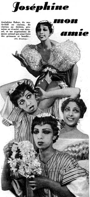 *** Notes : [1] Carlo Rim est le pseudonyme de Jean Marius Richard (1902-1989), romancier, essayiste, scénariste, réalisateur et dessinateur de presse français. Plus que la personnalité de l'auteur, c'est le ton plutôt représentatif de l'article qui nous l'a fait retenir. [2] Le célèbre cri popularisé par l'acteur Johnny Weissmüller à partir de 1932 serait en réalité l'enregistrement audio d'un yodel autrichien, monté à l'envers et en accéléré. [3] Bon exemple de la présentation que l'on fait alors de Joséphine : fantasque, « fofolle », exotique (transposition des accents américain et italien). Cela contraste avec la façon dont Joséphine se présente elle-même à cette époque : « Ah ! ces mois de mon premier été au Vésinet, je ne les oublierai jamais, non plus... Ils passèrent à la fois très vite et très doucement. Pourtant, le moment des répétitions de ma nouvelle Revue du Casino de Paris approchait... et passa à son tour. C'était Paris qui remue, qui dura d'octobre 1930 à mai 1931... Danses, couplets de la Petite Tonkinoise, de la Martiniquaise, des Deux Amours, de Sketches... Car, devenue aussi chanteuse, et comédienne, j'en avais voulu en terminer avec la revue à plumes et à bananes, renouveler le music-hall au double point de vue du rythme et du spectacle. Renouveler aussi Joséphine Baker !... Je ne venais pas seulement de faire le tour du monde, mais aussi et surtout le tour de moi-même. J'étais mille expériences réalisées, mille risques courus, mille plaisirs et mille peines... » In Le Roman de Joséphine Baker dans La Femme de France, juillet 1934.