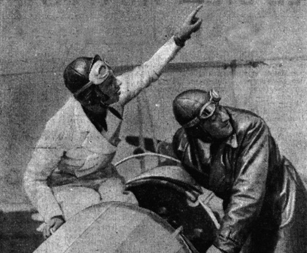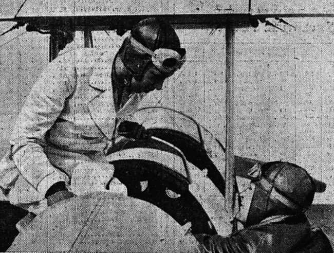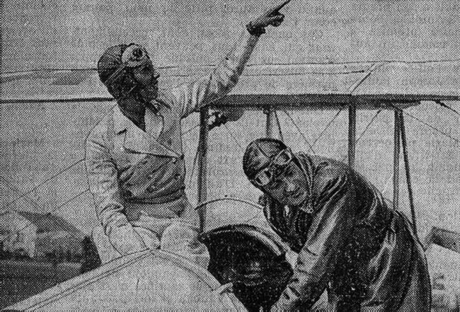 Joséphine Baker prend sa leçon de pilotage avec Demay. La voici prenant place dans la carlingue. Guyancourt, 11 mai 1935. Photo. Rol,