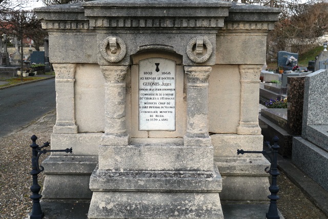 Cliché Christian Ramette, SHV, 2020. Quelques jours plus tard, le journal La Presse lui consacra une élogieuse nécrologie : [4] Un homme de bien, médecin expérimenté, s'est éteint, le 17 de ce mois, [17 août] à Rueil (Seine-et-Oise). La population entière de cette ville, et en partie celle de ses environs, rendaient, le lendemain, hommage à sa mémoire en assistant avec recueillement à ses funérailles. M. Guionis est mort, âgé seulement de soixante-deux ans, succombant aux suites d'une apoplexie aggravée par d'imprudents efforts accomplis pour continuer, malgré l'avertissement dont nul moins que lui ne pouvait méconnaître la gravité, une vie de travail et de dévouement. Nul ne réalisa plus complètement l'idéal du médecin bienfaisant. Tous ceux qui le réclamaient pouvaient, sans distinction de fortune, compter sur lui. Appelé au même instant chez le pauvre et le riche, c'est au premier qu'il eût d'abord donné ses soins. Son extrême désintéressement le faisait distinguer même entre ceux de ses confrères pratiquant aussi le principe que leur profession se doit à l'humanité souffrante avant de pouvoir y rechercher une rémunération légitime du temps employé et de la science acquise pour l'exercer utilement. Sa modération attendait toujours l'offre du salaire ; il pensait que la demande en était superflue auprès des clients dont l'aisance lui était connue, et qu'aux autres il devait épargner jusqu'à l'embarras qu'elle eût causé, à leur impuissance présumée. Avec une telle règle de conduite qui ne pouvait que l'éloigner de la fortune, sa clientèle dut incessamment s'accroître, tout en présentant parfois des variations qui l'honoraient. Elle se produisait lorsque des clients en retard envers lui, mais en situation de le satisfaire, cessaient de réclamer ses soins, afin d'éviter que sa présence chez eux ne leur rendît plus sensible le reproche, intérieur d'un tort de leur part très volontaire. Dans la pratique de son art il était doué d'une pénétration sûre. En lui la longue expérience avait accru chaque jour une forte instruction théorique. Aussi ne possédait-il pas la confiance des populations qu'il desservit, longtemps presque seul, il avait su gagner celle de plusieurs célébrités médicales de Paris avec lesquelles ses relations étaient fréquentes. Le grand opérateur, si justement promu à l'une des plus hautes dignités de l'Etat, l'a particulièrement distingué et a voulu lui en donner une preuve touchante dans sa famille. Atteint à l'un des pieds d'une infirmité qui menaçait de rendre toute sa vie misérable, le fils adolescent de M. Guionis était considéré par son père comme ne pouvant attendre d'autre soulagement, que celui d'une patiente résignation. M. Nélaton [5] en juge autrement. il croit une opération possible et d'un succès probable, mais aux prix de très vives douleurs, et d'un attentif pansement, dont il ne répond qu'à la condition d'y veiller lui-même avec continuité. Pour cela, il exige que le patient soit transporté chez lui, avec sa mère pour garde-malade. Cette généreuse.hospitalité, s'imposant comme une nécessité à la tendresse des parents, est acceptée. Elle se prolonge six mois entiers, et se termine, ainsi que l'espérance en avait été donnée, par une guérison. M. Guionis est mort officier de la Légion d'Honneur [6]. Il fut, jusqu'à sa dernière maladie, médecin de l'hospice impérial du Vésinet, ainsi que celui de la reine Christine d'Espagne pendant ses longs séjours à la Malmaison. L'amertume de la suprême séparation a été adoucie pour lui par la certitude acquise de son vivant, que son gendre, médecin comme lui [7], le remplaçait sur les mêmes lieux avec les mêmes avantages d'honneur et de considération. Le docteur Guionis avait été, en 1838, chirurgien aide-major au bataillon de la Garde nationale de Rueil et la Préfecture le nomma « médecin des épidémies » pour Rueil, Bougival, La Celle Saint-Cloud. L'épidémie la plus redoutée à cette époque, le choléra, fit de nombreuses victimes. En 1849, le département de la Seine fut durement affecté. Rueil ne déplora que huit victimes. Le bureau de bienfaisance avait distribué médicaments et secours en nature, la « classe pauvre » étant la plus touchée. Des enfants restant orphelins, on ne savait où les mettre. « Je me plais à rendre un témoignage très favorable au zèle et au dévouement de Messieurs les médecins et particulièrement de Monsieur le docteur Guionis, médecin des pauvres », écrivit au Préfet Monsieur Cramail (maire de Rueil de 1848 à 1870). Guionis est nommé en 1859 médecin en chef de l'Asile Impérial du Vésinet. L'établissement vient d'être construit « pour recevoir temporairement des ouvrières pendant leur convalescence ». Chaque année, 5 à 6 000 convalescentes profitent des bienfaits de cette nouvelle institution comprenant 350 lits et 50 berceaux. Quinze sœurs hospitalières de l'ordre de la Sagesse assurent les soins. Les convalescentes sont envoyées par les hôpitaux, les bureaux de bienfaisance, les sociétés de Secours Mutuels. Elles viennent par le train où un compartiment leur est réservé et à Chatou, un omnibus de l'asile vient les chercher. [9] Jules Guionis fut marié deux fois. En premières noces (1833) à Aglaé Biesta, fille d'Antoine Biesta, ancien notaire de Bougival et Maire de cette commune, décédée après deux ans de mariage sans avoir eu d'enfant. En secondes noces à Victoire Pauline Paillieux ; trois enfants naîtront de cette union : Camille Pauline en 1837, Julie Pauline en 1840 et Jules en 1844. Ce dernier, après avoir entrepris des études de médecine, abandonna cette profession. En 1870-1871, il était employé dans l'équipe soignante de l'Ambulance de l'Asile. Marié dans l'Indre en 1880, il mourra deux ans plus tard à Saint Yrieix (Haute-Vienne), étant directeur de l'usine à gaz locale. **** Notes et