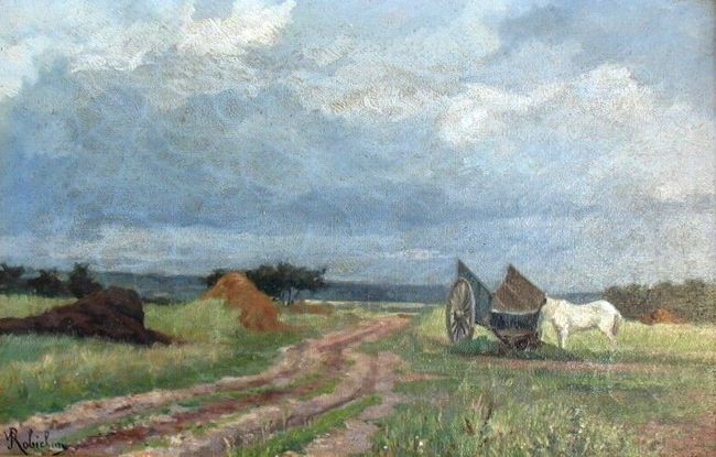 Jean-Paul Debeaupuis, SHV, mars 2013 (compléments juillet 2021). Jules Robichon (1839-1914), artiste peintre Jules Paul Victor Robichon est né à Paris (4e) le 30 août 1839, fils de Louis et Célestine Gilton, son épouse. Le 16 novembre 1867, à Paris (9e) il a épousé Jeanne Lestrem-Pussacq âgée de 21 ans, originaire de Mourenx, Basses-Pyrénées (aujourd'hui Pyrénées Atlantiques) couturière, fille d'agriculteurs. A cette date, Jules Robichon exerce la profession de peintre décorateur. En 1875, Robichon est installé à Pau où il compte vivre de son art. Mais une petite annonce parue dans L'Indépendant des Basses-Pyrénées nous apprend que, « pour cause de départ » aura lieu la vente « d'une collection de tableaux, dans laquelle se trouvent de très-belles copies des principaux tableaux du Musée, et quelques bonnes toiles de maîtres : Dessins originaux, aquarelles, gravures, objets d’art, meubles anciens et modernes, faïences, ustensiles ayant trait à la peinture ; le tout composant l’atelier de M. Jules Robichon, artiste peintre à Pau. La vente aura lieu dans l’atelier de l’artiste, rue Serviez, numéro 17, le mardi 23 mars 1875, à dix heures du matin, et jours suivants. » [3] C'est à Tours (Indre-et-Loire) que quelques mois plus tard « Un peintre de passage à Tours, M. Jules Robichon, qui [...] a laissé d’excellents souvenirs à Pau, expose en ce moment chez Mme Berthiaut, une vue de l'Ile Aucard. Ce paysage semble bien consciencieusement étudié : les premiers plans sont solides, la peinture large et facile. On y sent un artiste savant, pour qui la campagne n’a pas besoin de se mettre en frais de représentation, à qui le premier coin venu suffit. M. J. Robichon nous est du reste déjà connu ; son tableau « Les bords de la Loire », exposé au Salon de cette année et justement apprécié par un de nos meilleurs critiques d’art, dénote un réel tempérament de paysagiste. Nous espérons le retrouver au prochain Salon, et lui souhaitons bien cordialement le succès qu’il mérite. [4] Nous engageons les amateurs à visiter la collection de tableaux de M. Jules Robichon, qui sera exposée le mardi 14 novembre, de 10 heures à 2 heures, à l’Hôtel des ventes, rue Scribe, n°7. Les tableaux de ce jeune peintre sont consciencieusement étudiés, la peinture en est large et facile : on y sent un artiste d’avenir, peur lequel ta nature n’a pas besoin de se mettre en frais de représentation, |à qui le premier coin venu suffit. Au Salon de 1876 il a exposé, sous le numéro 1754, un tableau représentant une vue des bords de la Loire ; ce paysage a été justoment apprécié par un de nos meilleurs critiques d’art. [5] Satisfait sans doute de l'accueil des Tourangeots et de leur goût pour « la bonne peinture », Robichon organisera encore d'autres ventes à Tours quelques années plus tard. [6] En 1876, Jules Robichon apparaît sur le catalogue du Salon des Artistes français. Il habite alors au Vésinet, à l'angle de la rue du Pecq (n°8) et de la rue de l'Eglise (n°12) soit aujourd'hui angle Maréchal-Foch/Ernest-André. Sa mère, veuve, est domiciliée alors dans le même immeuble, au 14 de la rue de l'Eglise. Après le départ de Jules à Asnières, elle ira habiter jusqu'à sa mort au 14 route de Montesson. Membre de la Société des artistes français, Robichon expose chaque année au Salon des œuvres très classiques : Les bords de la Loire aux environs de Tours, l'hiver (1876) ; Une clairière dans le bois du Vésinet (1877) ; Retour du marché (1878) ; Une table dans la cuisine de mon père la veille de mes noces (1879) ; Provisions d'hiver, préparations des conserves d'oies dans le midi (1880) ; Intérieur d'une vieille cour à Rennes (1882). En 1879, l'Hôtel Drouot lui consacre un catalogue de 8 pages répertoriant 108 toiles.