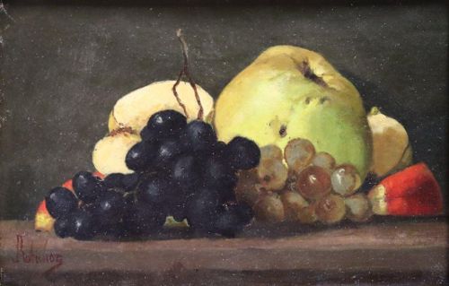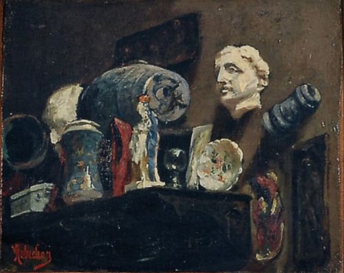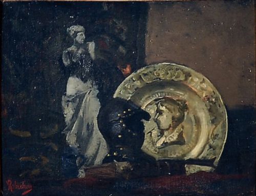 Jules Robichon, Nature morte à l'assiette et sculpture. Huile sur toile [19 x 25 cm]
